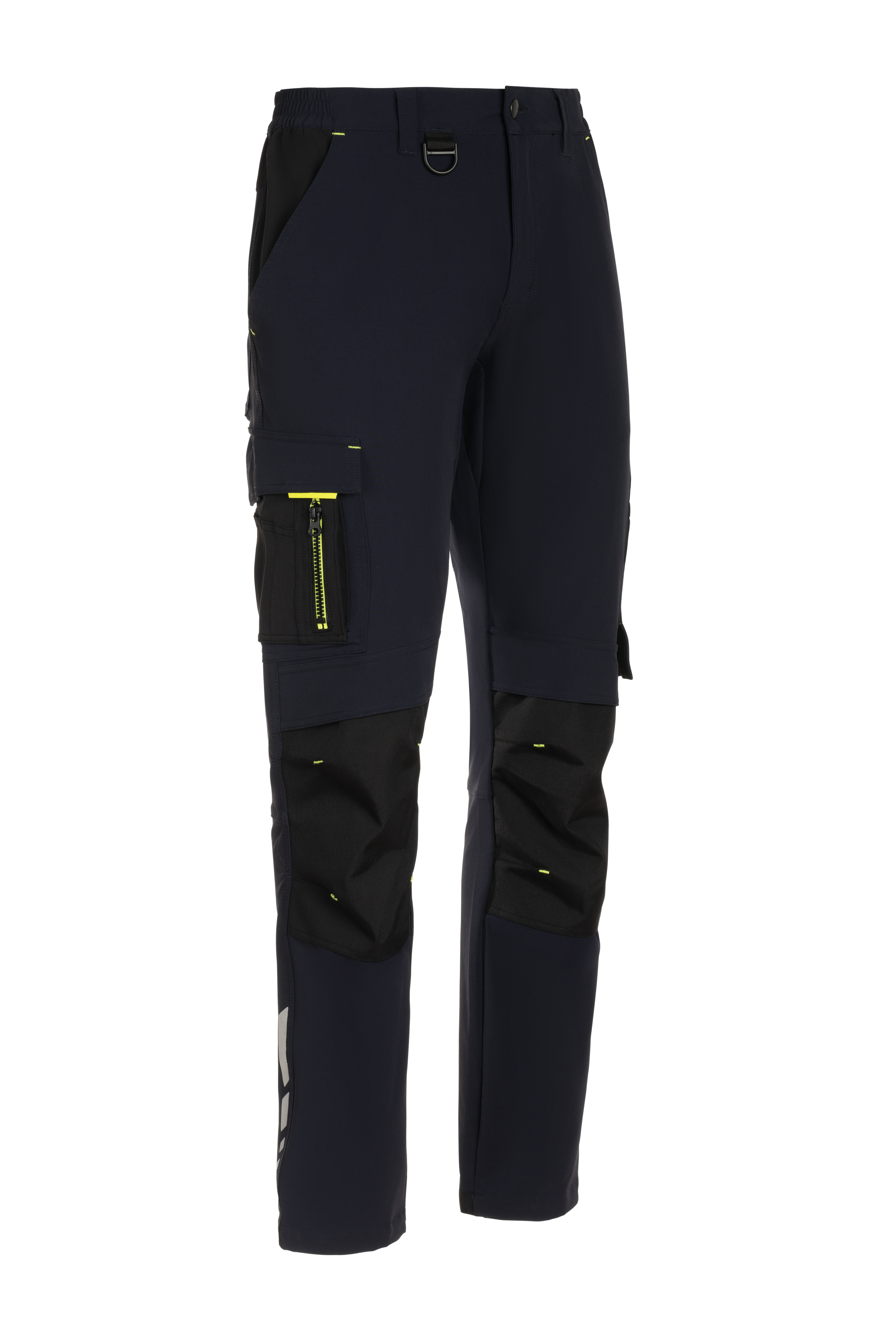 UNI EN ISO 13688Pantalone SuperstretchCintura con 5 passanti, passante posteriore di forma trapezoidale ed ealstico ai fianchi per un maggiore comfort evestibilitàApertura anteriore chiusa con zip coperta da patta e bottone in mettallo tono su tonoDue tasche laterali a filettoUn Tascone sulla gamba destra chiusa con pattina e un pezzo di velcro, nella pattina è presente un piping giallo fluo,sul tascone è inserita una tasca porta monete chiusa con zip a contrasto florescente e tre taschini porta penneUna tasca porta metro sul lato sinistro in colore a contrastoPorta ginocchiere chiuse con pattina e velcro, performate in tessuto in corduraDue tasche posterioriFascia salva reni in colore a contrastoRiporti rifrangenti al fondo gambaFondo gamba con orloRinforzo al cavalloTravette in colore giallo fluo