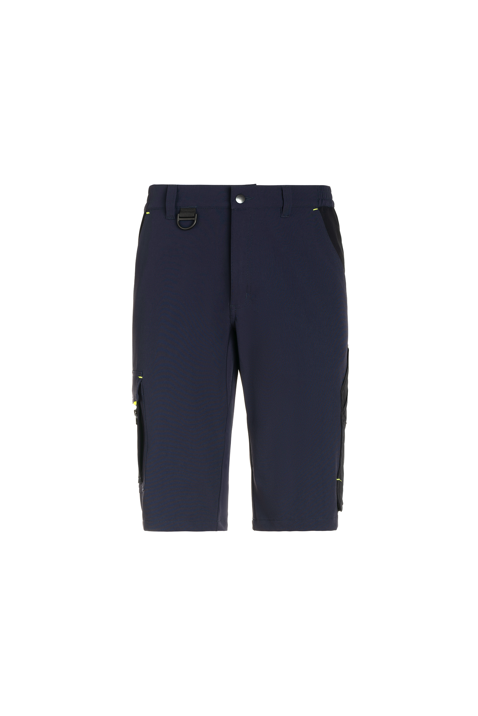 UNI EN ISO 13688Bermuda SuperstretchCintura con 5 passanti, passante posteriore di forma trapezoidale ed ealstico ai fianchi per un maggiore comfort evestibilitàApertura anteriore chiusa con zip coperta da patta e bottone in mettallo tono su tonoDue tasche laterali a filettoUn Tascone sulla gamba destra chiusa con pattina e un pezzo di velcro, nella pattina è presente un piping giallo fluo,sul tascone è inserita una tasca porta monete chiusa con zip a contrasto florescente e tre taschini porta penneUna tasca porta metro sul lato sinistro in colore a contrastoDue tasche posterioriFascia salva reni in colore a contrastoRinforzo al cavalloTravette in colore giallo fluo